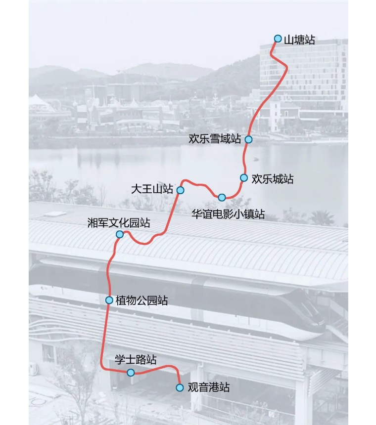 为不占用道路资源、最大限度减少对道路交通的影响,采用了高架敷设方式,共设9座车站,串联了大王山旅游度假区欢乐雪域、欢乐水寨、华谊兄弟电影小镇、湘江女神公园、桐溪湖、桐溪公园、欢乐海洋等十余处景点。各文旅景点恰如一颗颗璀璨的明珠,镶嵌在大王山旅游度假区之上,而欢乐云巴宛如一条项链串联着闪耀的“明珠”,为大王山旅游度假区打造出一串最别致的珍珠项链。